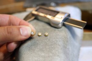 ご家族でお揃いのペンダントを、ただいま心を込めて制作しています。 原型からK18ゴールドへ。ひとつずつ磨き上げ、ダイヤモンドを並べた状態で、セッティング前の最終チェックを行いました。 お揃...